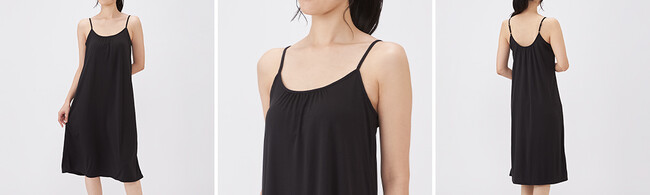 昨年販売し人気のルームウェアとして使えるペチワンピースをアップデート。胸元・背中がより美しく見えるようにデザインを見直し、カラーは、暗い色の洋服にも合わせやすいブラックと、透けにくく、上品なモカの2色展開になっております。取り外しが可能なカップがついているため、ブラやインナーを重ねつけする必要がなく、お風呂上りやリラックスタイムにもおすすめです。また、ステッチ糸の一部には静電気防止の糸を使用することで、静電気を抑制してくれます。
