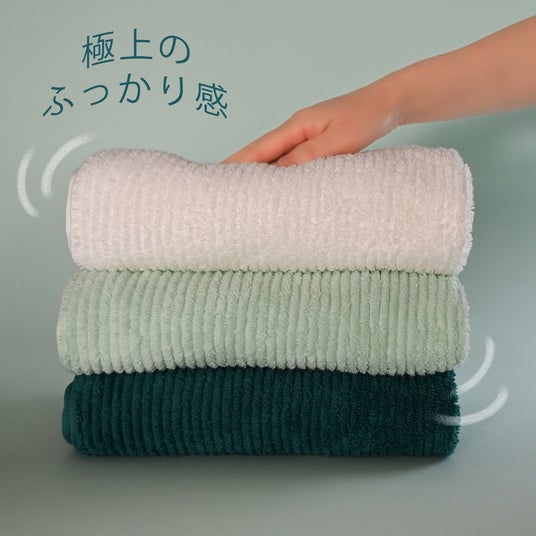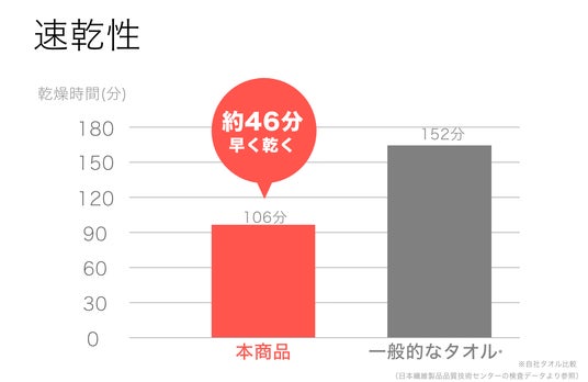 肌に触れるパイルが長くなることで肌触りを気持ちよく、また畦部分を作ることで通気性を向上させ、一般的なタオルよりも46分早く乾きます。