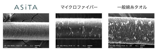 これまでのタオルは「ふわふわな肌触りを追求すると、毛羽が大量に落ちる」もしくは「毛羽落ち対策をすると、肌触りが悪く吸水性も低い」というトレードオフの関係がありました。糸が原材料であるタオルはこの2つを両立することが難しく、またその商品の開発も困難とされていました。そこで「ASiTA BALANCE TOWEL」は、タオルの質を決める糸に着目し、「心地よい肌触り」かつ「毛羽が落ちない」タオルの開発に着手。特許技術をもつ「スーパーゼロ」の糸を使用することで、20回洗ってもふんわりとした肌触りが変わらず、また毛羽落ちもわずか0.05%のタオルを開発することに成功しました。さらにこの糸を使うことで、摩擦抵抗が少なく、髪のキューティクルを傷つけないタオルに仕上がりました。
