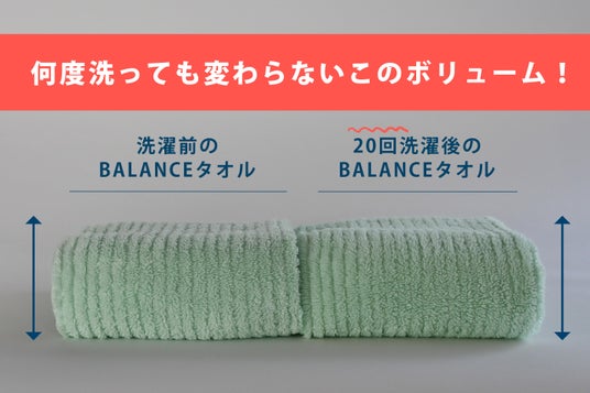 糸自体に練り込まれた空気により、ボリューム感もありつつ、柔らく軽量。クッションのようなふわふわ感は繊維の反発の働きで簡単にはへたりません。また、洗濯前と20回洗濯した後でも変わらず、柔軟剤を使わなくてもふんわり感が持続。繰り返し使ってもゴワゴワすることはありません。