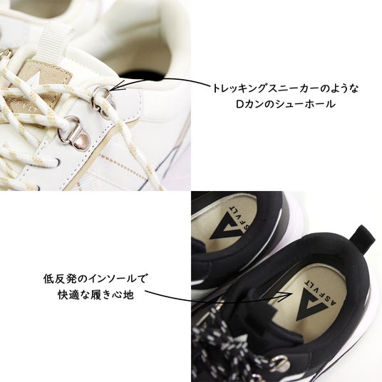 凸凹のソールで黒でも軽くスッキリとした印象になり、女性でも使いやすいブラックにこだわった配色です。
