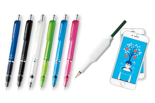 ↑写真の、芯を徹底ガードし折れを防止するシャープペンシル「デルガード」(ゼブラ・2014年)や、子どもの勉強の習慣化を促すIoT文房具「しゅくだいやる気ペン」(コクヨ・2019年発売)など。