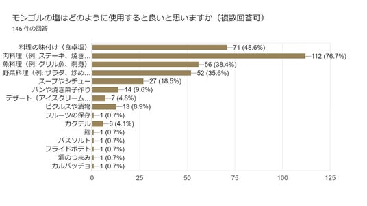 山の塩(岩塩)は、粒状で存在感があり肉料理と相性がいいです。瓶タイプはミル付きのため、料理の仕上げや食卓塩にも適しています。実際に一般の方144名への事前アンケートでは、112名が肉料理に、70名が食卓塩に適していると回答しました。(上グラフ参照)