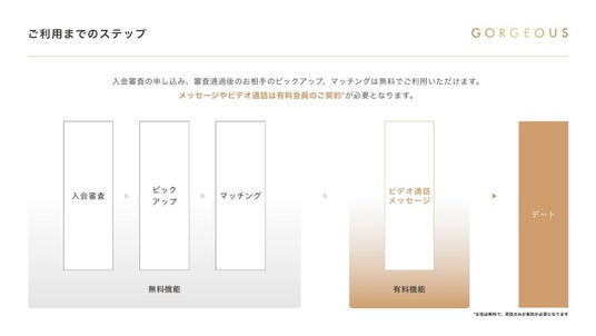 ゴージャスランクは理想の出会いを実現するうえでの一つの指標と考えており、その他の機能も今後拡充していくことで会員の皆さまの恋活・婚活をサポートさせていただきます。