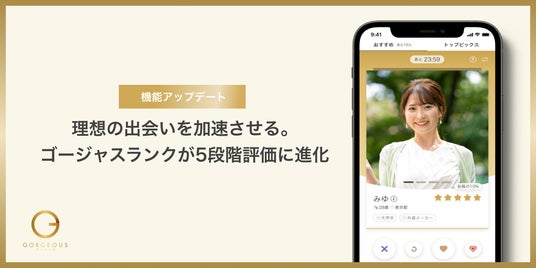 アイザック株式会社(本社:東京都渋谷区、代表取締役社長 田中 和希)が提供する出会いの質にこだわった審査制恋活・婚活マッチングアプリ「ゴージャス」では、これまで3段階制だったランク評価を5段階制にアップデートいたしました。