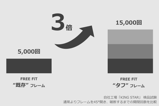 新作は、フレームが型崩れした時に負荷がかかりやすい丁番のパーツに壊れにくい5枚丁番を採用。自社工場キングスターでは、フレームの耐久性や強度を確認するため、テンプルを外側に40°開き2万回開閉して破損しないかを確認するテストを行っています。新作は更に負荷の掛けた条件(テンプルを外側に45°開きその開閉数を確認)でテストを行ったところ既存フレームは開閉5000回まで耐久し、新作では1万5000回を記録。既存フレームの3倍高い耐久性を実証しました。
