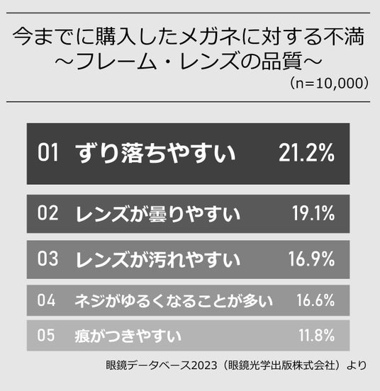 眼鏡データベース2023(眼鏡光学出版株式会社)の「今までに購入したメガネに対して「不満」と感じた具体的内容」のアンケートにて、フレーム・レンズの品質について一番多かった回答は「ずり落ちやすい」21.2%でした。この結果をもとに、激しい動きでもずれ落ちにくい「タフシリーズ」の開発がスタート。第一弾は野外で活動する方へ向けた「i-ATHELETE」を展開。第二弾となる今回は、室内で活動する機会が多い方に向け、FREE FiTの軽くてかけやすい機能性はそのままに、既存より3倍高い耐久性の新作モデルが登場しました。