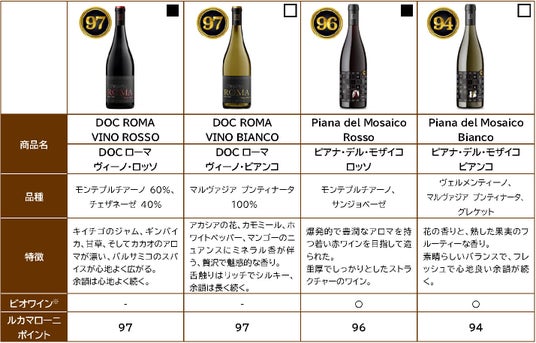今回発売する11種類のワインのうち7種は、イタリアワインの鑑評家であるルカ・マローニ氏から94点以上という高評価を受けています。