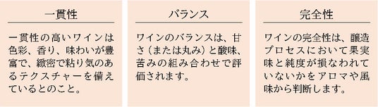 マローニ氏の評価手法は、ワインの品質と魅力に焦点を当て、「一貫性」、「バランス」、「完全性」の3つのカテゴリーに分類されています。これらのカテゴリーはそれぞれ33点で評価され、総合99点が最高得点とされています。