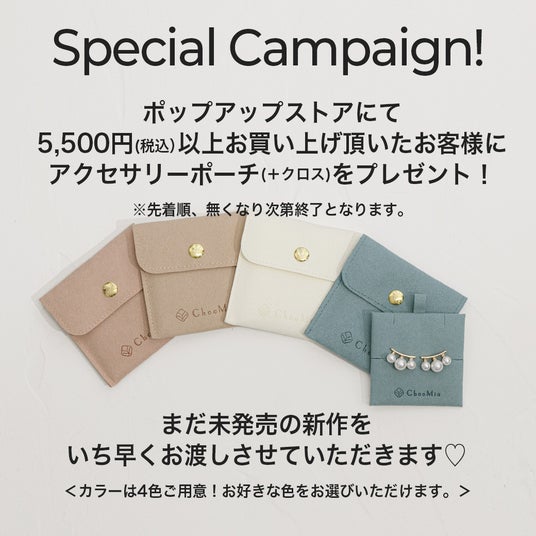 ポップアップ開催期間中に店頭で5,500円(税込)以上お買い上げ頂いたお客様に、アクセサリーポーチ(+クロス)をプレゼントいたします。