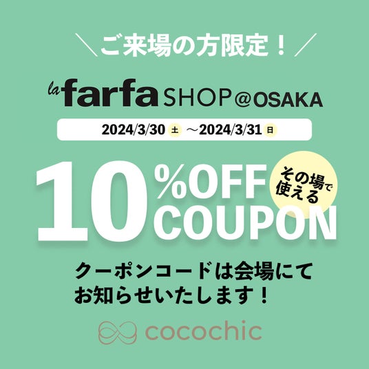 ご来場の方限定でcocochicオンラインストアで使える2日間有効の10%OFFクーポンを配布いたします。