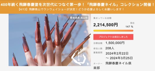 私たちの活動をより多くの人に知ってもらい、支援・応援していただくために2月22日よりクラウドファンディングを実施。200人以上の方からご支援いただき、「飛騨春慶ネイルコレクション」開催のために掲げていた目標金額を達成することができました。