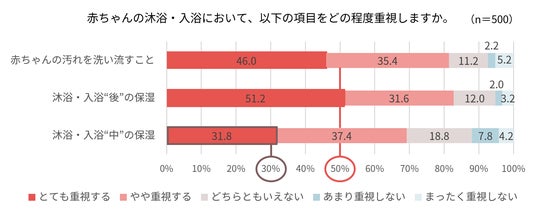 沐浴・入浴において「とても重視する」こととして、約5割のプレママ・ママが「汚れを洗い流すこと」や「沐浴・入浴“後”の保湿」と回答。一方で、「沐浴・入浴“中”の保湿」は3割程度で約20ポイントの差があり、赤ちゃんのからだを洗う段階からの保湿への意識は低いことが明らかになりました。