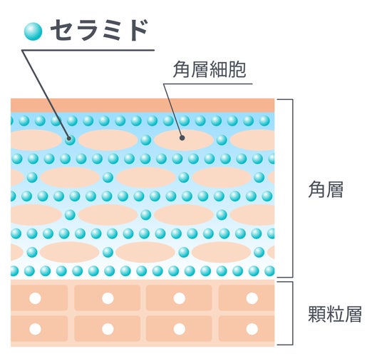 肌の保湿のために重要な保湿成分の「セラミド」 セラミドは角層細胞どうしのすき間を満たし、肌内部の水分を繋ぎとめている肌の保湿成分です。肌を外部刺激から守る「バリア機能」をきちんと働かせるための主役となる成分で、十分なセラミドで満たされた肌はバリア機能の働きが高く、外部刺激で肌荒れしにくい状態です。