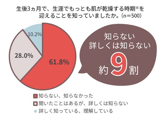 赤ちゃんの肌は生後3ヵ月頃から皮脂分泌量が低下しはじめ、生涯最大のお肌の乾燥期を迎えることをご存じでしょうか。意識調査では9割近い方が「知らない、知らなかった」「聞いたことはあるが、詳しくは知らない」と回答しており、ほとんど認知されていないことがわかりました。