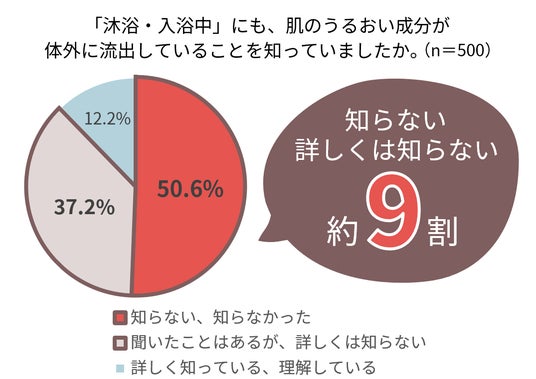 また、入浴中に肌は水分を含み飽和状態になり、角層細胞が広がることで保湿成分「セラミド」などのうるおい成分が体外へ流出している(2)こともあまり知られていません。意識調査では半数以上の方が「知らない、知らなかった」と回答しており、「聞いたことはあるが、詳しくは知らない」も含めると9割近くに上りました。