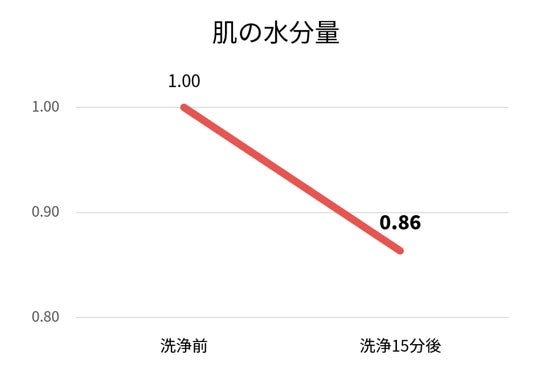 肌表面の水分の蒸散量は洗浄前と比べて、洗浄直後に約6.7倍増加していることがわかりました。また、洗浄前と洗浄15分後の赤ちゃんの肌の水分量を比較すると、平均で14%減少しました。