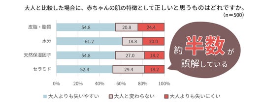 赤ちゃんの肌と聞くとすべすべの肌を思い浮かべる方もいるかもしれませんが、実はとてもデリケートで未熟。肌の表皮の厚さは大人の約半分と言われており、赤ちゃんの肌は気温の変化、乾燥、ダニやハウスダストなどの刺激に敏感です。意識調査では約半数の方が「大人よりも赤ちゃんの方が、セラミドをはじめとするうるおい成分を失いにくい」または「大人と変わらない」と回答しており、赤ちゃんの肌に対する誤解が浮き彫りになりました。