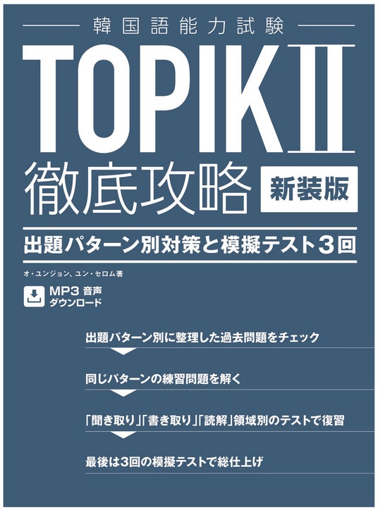 「出題パターンを分析した解説、過去問題と豊富な練習問題を通じて問題に慣れた後、実践さながらの模擬テストを通じて、中級、上級対象の韓国語テストTOPIK IIを攻略する対策書です。」(韓国語のHANA公式サイト本書説明より)