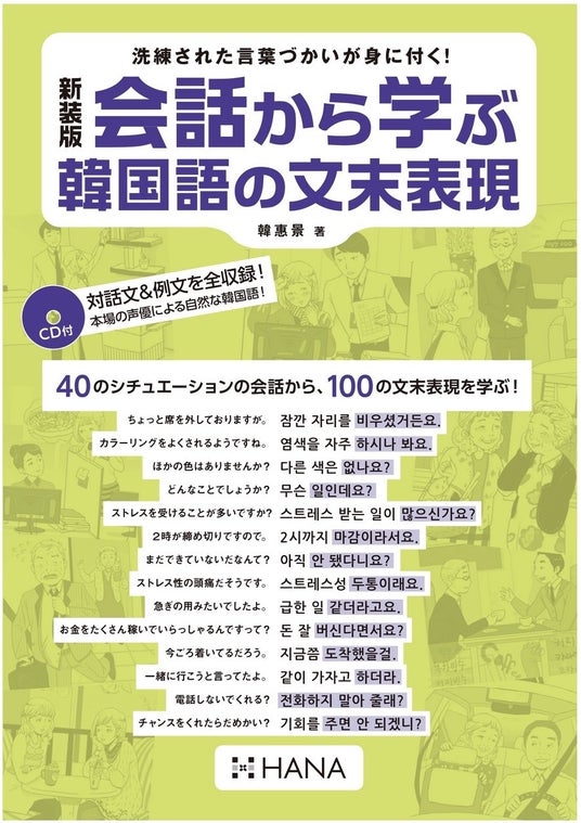 「主人公の女性ナナとその家族、職場での日常会話を通してさまざまな文末表現の使い方と言葉遣いを学びます。本書の文末表現をマスターすることで、これまでとはひと味違った魅力のある素敵な韓国語の会話ができるようになるでしょう。」(韓国語のHANA公式サイト本書説明より)