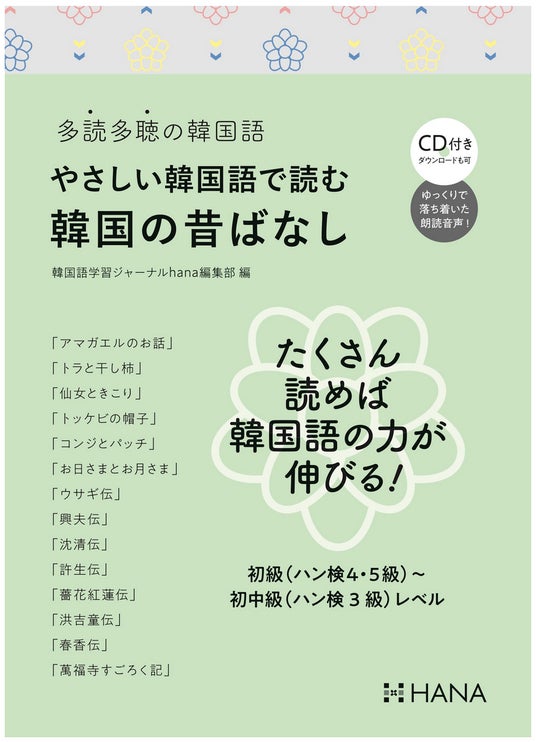 「韓国で広く知られている昔話(古典、民話)を、やさしい韓国語で書き直した学習者のための多読用素材集です。平易な語彙と文法を使用し、一つの物語を読みやすく再構成しました。さらに、作品を丁寧に読み上げた音声がCDに収められています。」(韓国語のHANA公式サイト本書説明より)