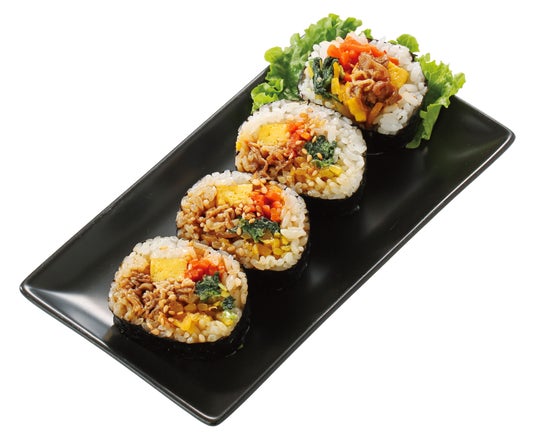 4種の具材をたっぷり盛り込んだ、お肉と野菜を楽しむキンパです。ごま油の風味がきいた韓国海苔で巻き上げました。