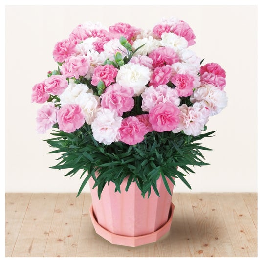 「母の日ギフト」カタログでは、色の変化が楽しめるカーネーションの鉢植えや可愛らしい花束など、計61商品を掲載しています。