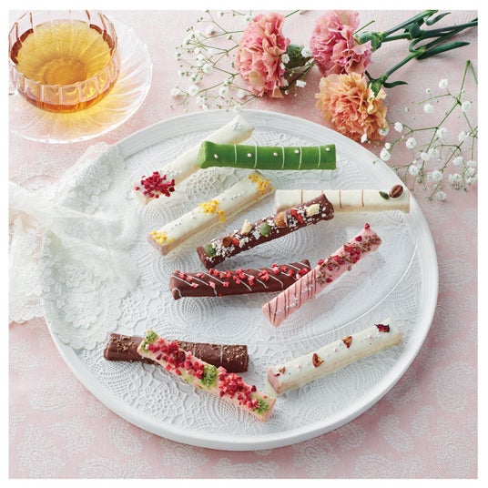5種類のフレーバーによって異なる色とりどりのトッピングとチョコレートコーティングが心をくすぐる、宝石のような華やかなスイーツです。