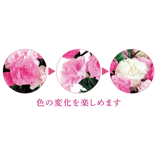 カーネーション「いちごソフト(R)」はピンクから白に近い淡いピンク色へ色が変化していくので、1つの鉢で可憐な花色を楽しめます。