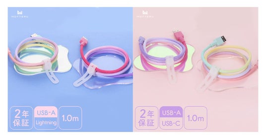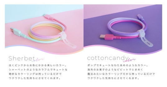 今回は新たなお色味を発売。グラデーションカラーの「シャーベットカラー」「コットンキャンディーカラー」の2色展開で、USB-A to LightningとUSB-A to USB-Cのケーブル2種を発売します。