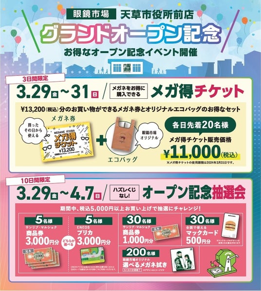 買ったその日から使える13,200円分のメガネ券とオリジナルエコバックのお得なセットを発売。また、オープン10日間限定で、商品券3,000円分やプリペイドカード3,000円分等が当たるオープン記念抽選会も開催します。