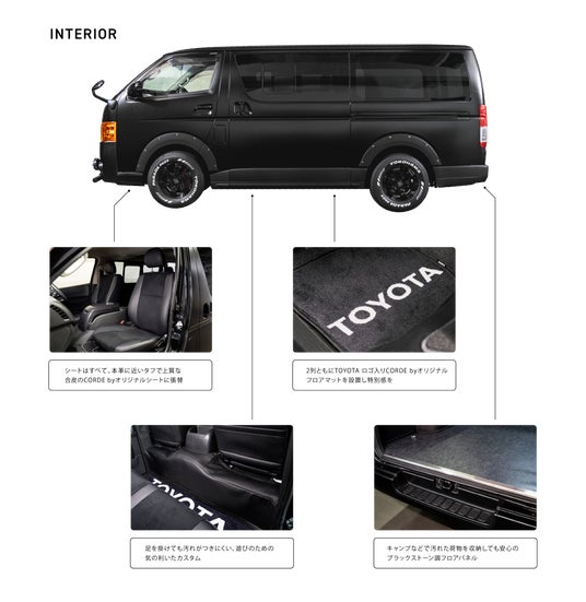 HIACE THE CREWVANは、ボデーカラーがマットブラックに施され、ホワイトレターのTOYOTAロゴエンブレムを装着したSTANDARDパッケージが基本となります。その他にお客様のスタイルにあわせたカスタムアイテムをお選びいただけます。