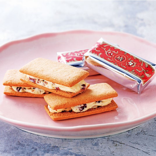 六花亭専用の小麦粉で作ったビスケットで、ホワイトチョコレートとレーズン、北海道生乳100%のバターをあわせたクリームをサンド。