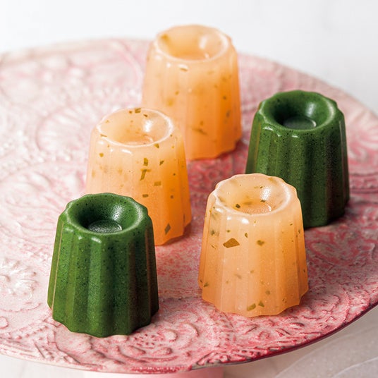 ほのかに塩気のある桜と、濃茶のような味わいの抹茶のカヌレ型羊羹。