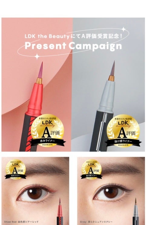 抽選で10名様に、今回A評価を受賞したアイライナー「リキッドアイライナー シアーレッド」「リキッドアイライナー グレー」から、ランダムでどちらか1本をプレゼント。