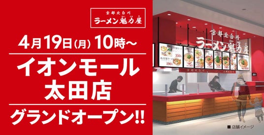 京都北白川ラーメン魁力屋をチェーン展開する株式会社魁力屋(https://corp.kairikiya.co.jp/ 本社:京都市中京区、代表取締役社長:藤田 宗、以下魁力屋)は、2024年4月19日(金)に「京都北白川ラーメン魁力屋 イオンモール太田店」(群馬県太田市)がグランドオープンいたします。