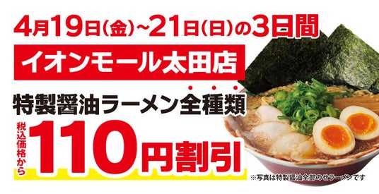 この度オープンを記念して、「イオンモール太田店」にご来店いただいたお客様には、『特製醤油ラーメン全種類』を税込価格から110円割引で販売いたします。