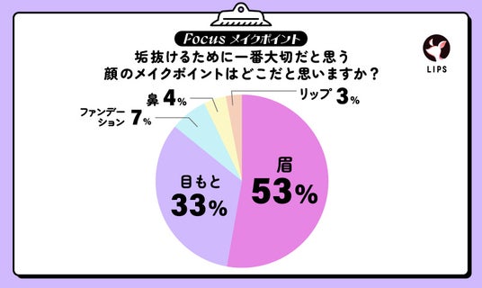 垢抜けメイクのポイントについて、なんとユーザーの2人に1人が、取りかかるべきは「眉」と回答。2位の「目もと」も3割を超えていることから、眉から目もとにかけての印象を最重要視する声が全体の9割近くを占める結果となりました。