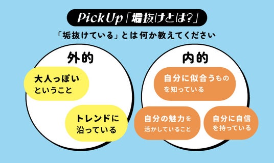 垢抜けている状態について尋ねたところ「大人っぽさ」などの外的印象の他に「自分に似合うものを知っている」「自分の魅力を活かしている」や「その人が明るくいきいきとしていること」「自信を持っていること」など、外見以外の印象を挙げる人が想定以上に多く見られました。