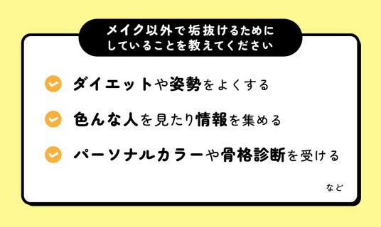 また「メイク以外で、垢抜けるためにあなたがしていることを一つ教えてください」という質問も自由記述で投げかけてみました。