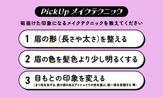 あわせて「垢抜けた印象になるメイクテクニックを教えてください」という質問を投げかけてみたところ、眉の形・眉の色・目もと印象の3点に言及した回答が上位に並びました。