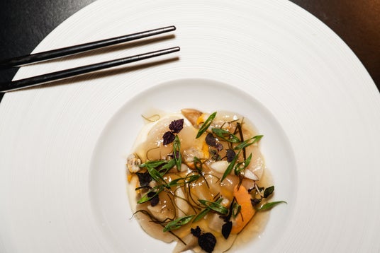 日本の美学とテクニック、そしてフレンチのノウハウが融合されたフランコ=ジャポネの美食の数々は、昆布のだしの取り方をはじめ、日本料理の技術も食材に合わせて取り入れつつ、使用した食材の味や風味を最大限に生かしながらフレンチの魅力を伝えられるように調理行程が設計されました。例えば、メインの仔牛はフランス料理において伝統的な組み合わせであるモルネーソースで提供。本来はチーズを入れてソースを仕上げるところを、同じ発酵食品である白みそを入れることで昔からフランスにある味を再現し、生粋のパリジャン、パリジェンヌたちを驚かせました。