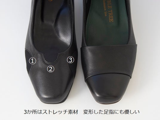 外反母趾や内反小趾気味の足に配慮。骨が出っ張っている方でも、あたりが優しい伸縮性のある素材が使われています。該当箇所はデザイン上レザーでカバーされており、足の変形が目立ちにくくなっています。