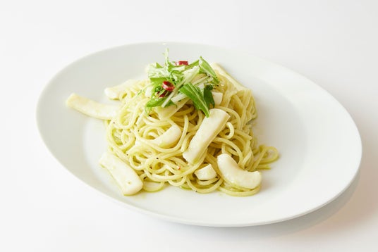 九条ネギとイカのジェノベーゼ風九条ネギソースとイカを絡めたスパゲティ。