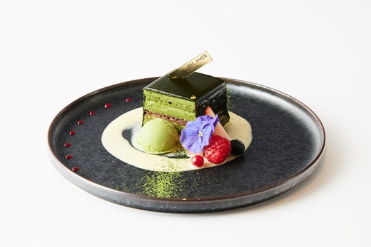チョコレートの球体の中からは柔らかいミルクチョコレートのムースや抹茶のビスキュイ、抹茶のジュレ、ラズベリーソース、が溢れ出します。