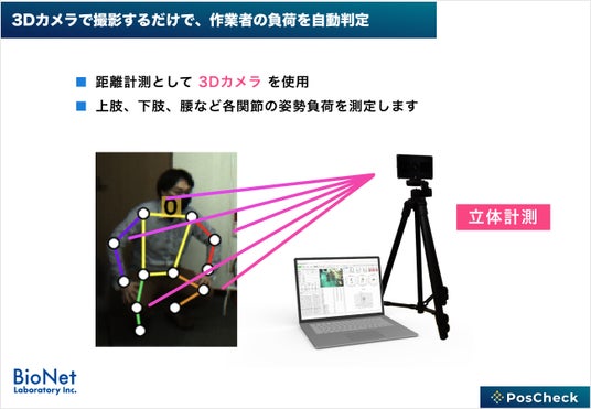 高齢者に限らず、作業者の腰痛防止や労働環境の改善、危険回避には、作業状況の把握と安全管理が必要です。作業負荷自動計測システム「PosCheck」は、3Dカメラで人体の骨格を立体的に捉え、姿勢負荷を数値化することで、事故原因の可視化や危険回避、環境改善に役立ちます。