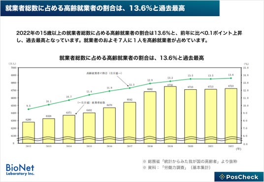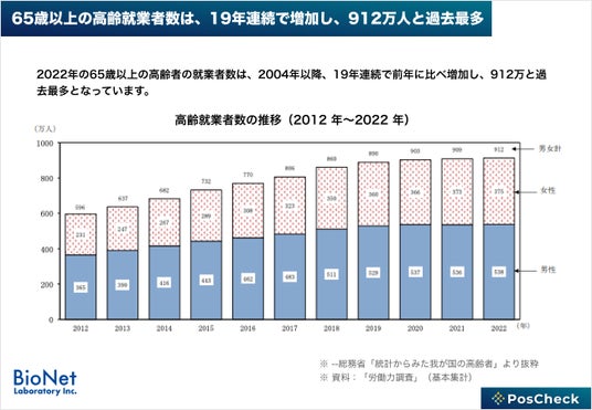 厚生労働省発表資料および総務省統計局提供のデータによると、65歳以上の高齢者の就業者数は、19年連続で増加し912万人と過去最多を記録し、就業者総数に占める高齢者の割合も13.6%と過去最高水準を記録しています。