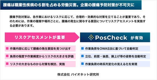 今回ご紹介する【 作業負荷自動計測システム「PosCheck」】は、安全衛生管理体制の確立と、労働災害や腰痛問題などの社会課題に役立ちます。