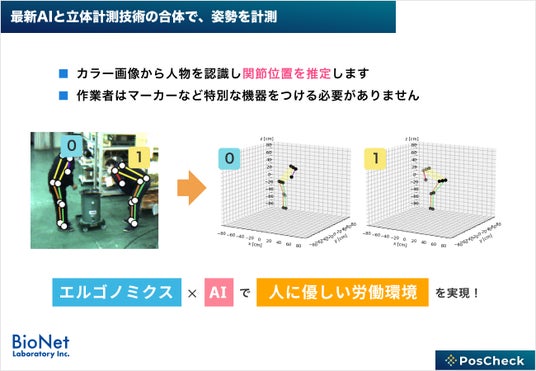 「PosCheck」は3Dカメラで撮影するだけで、作業者の姿勢負荷を自動判定。AIとOWAS法アルゴリズムを活用し、労働者の腰痛原因や作業環境の改善点を可視化します。