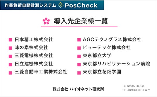 腰痛問題や安全衛生管理に関するバイオネット研究所の取り組みをご紹介します。 PosCheckはこれまで、大手建機メーカー様、大手上場企業様の工場や作業施設の他、病院、大学など、さまざまな場でご活用いただいて参りました。